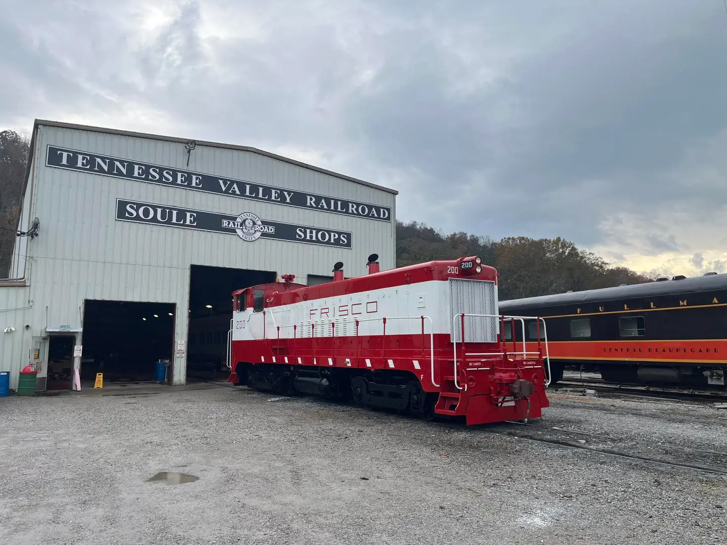 When Saint Louis–San Francisco Railway (Frisco) locomotive 200 rolled out of the Tennessee Valley Railroad Museum’s Soule Shops this morning, it wasn’t just another shop move. It was the return of a one-of-a-kind diesel, wearing its familiar Frisco paint scheme once more and ready to work again after a decade in storage and more than 80 years since it first turned a wheel.