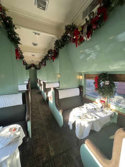 Passengers may choose from true vintage dining in the Dining Car (four to a table) or the smaller tables for two in Pullman Car Clover Colony.